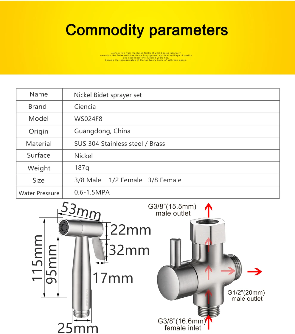 Tecmolog Hand Held Bidet Sprayer Shattaf Stainless Steel Cloth Diaper Sprayer Set with 3/8” T Valve and Bracket Holder, Brushed Nickel WS024F8